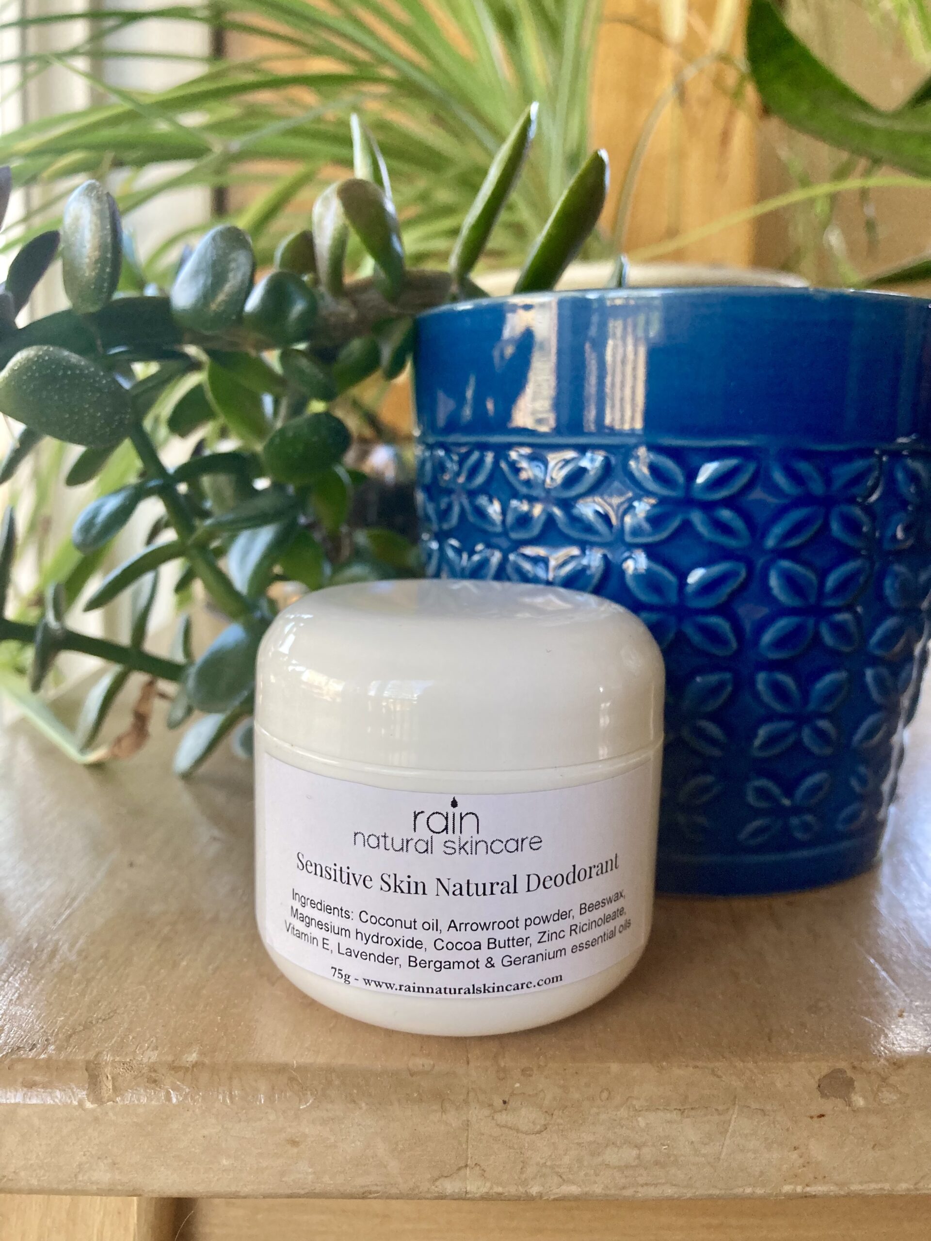 Sensitive Skin Deodorant in Jar Ingredients: Coconut oil, Arrowroot powder, Beeswax, Magnesium Hydroxide, Cocoa Butter, Zinc Ricinoleate, Vitamin E, Lavender, Bergamot and Geranium essential oils